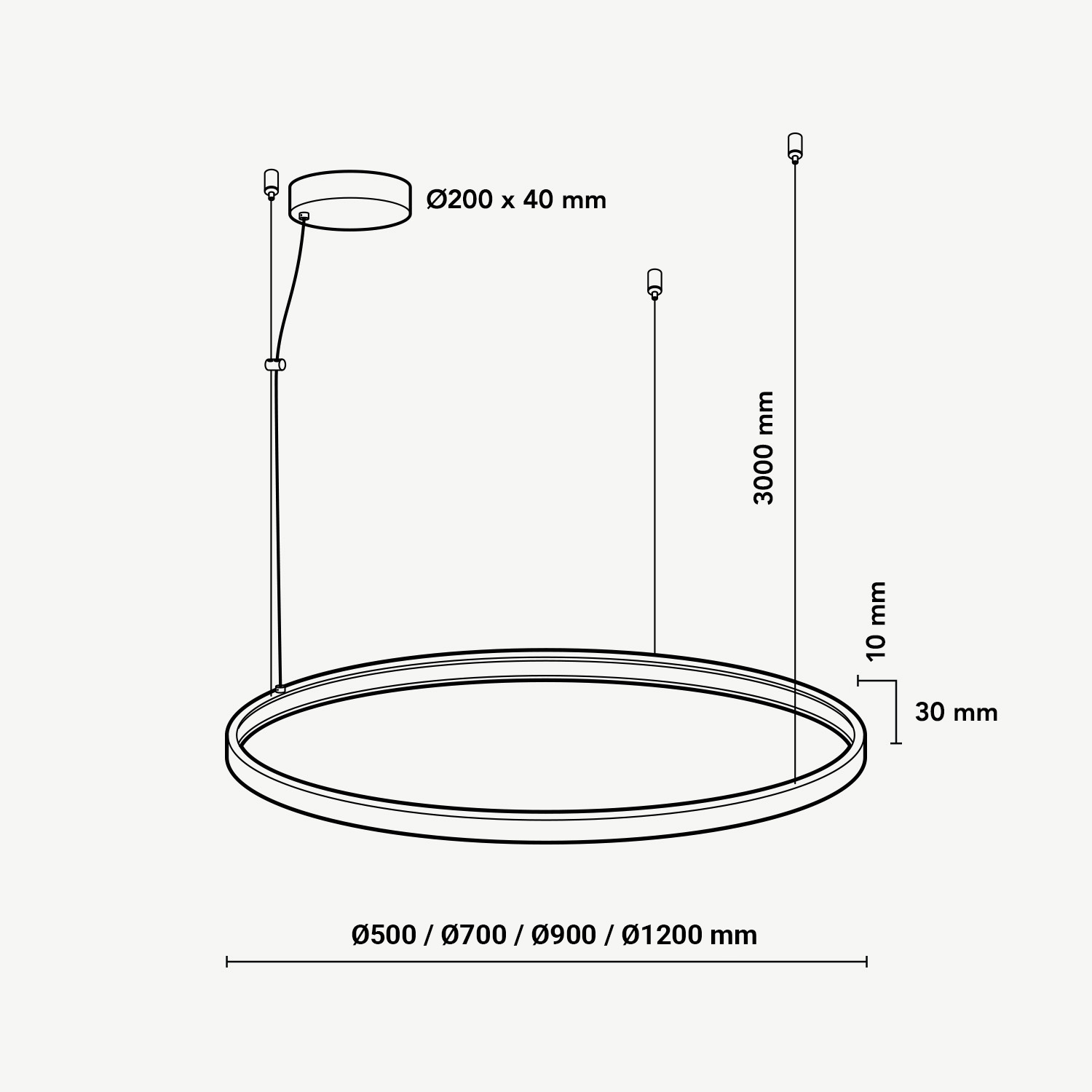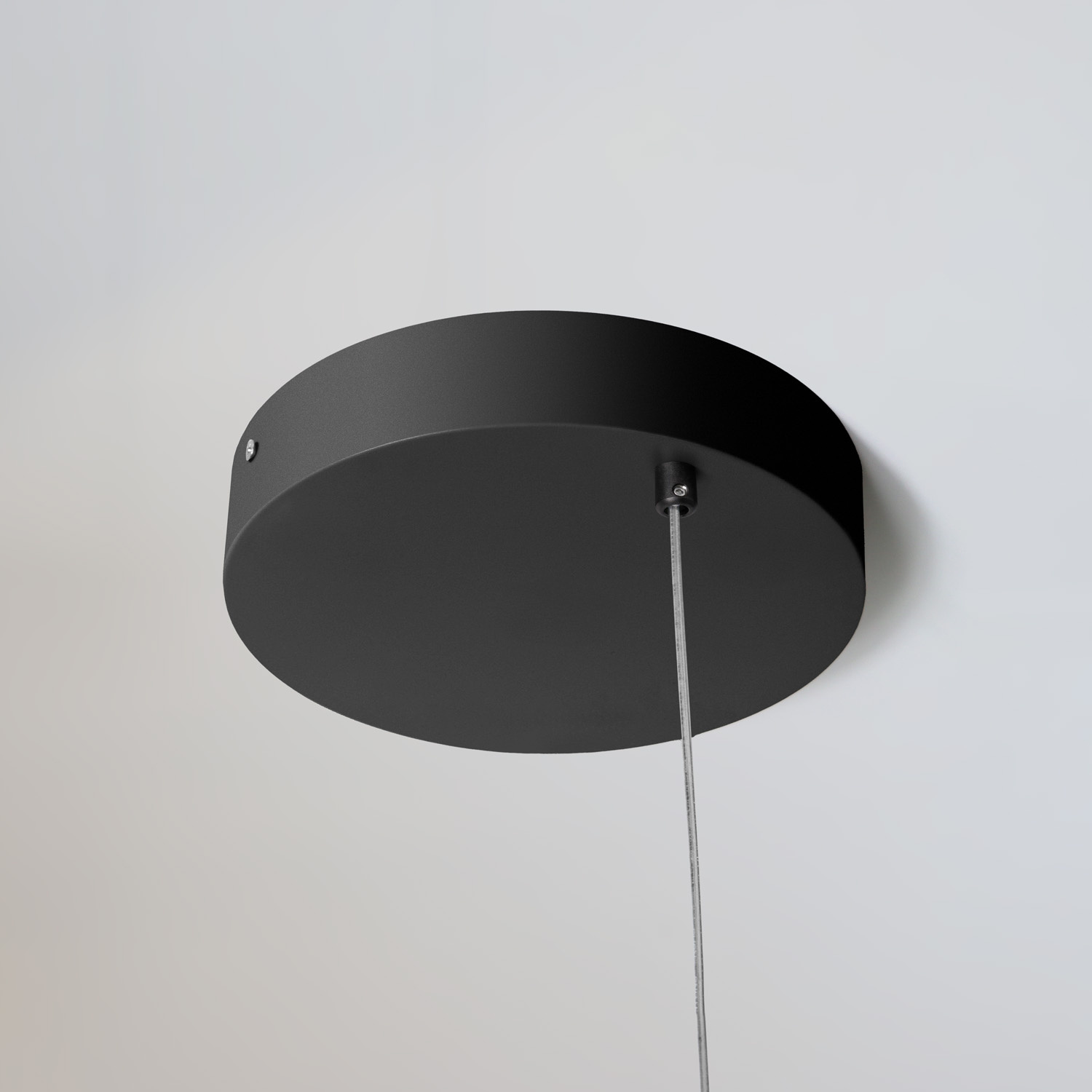 The HALO series is available in four different sizes: ø500 mm, ø700 mm, ø900 mm and ø1200 mm. The luminaire is designed to provide evenly diffused light on the inside of the ring, promising a harmonious and well-lit space. The fixture is mounted on the ceiling with 3 adjustable steel wires. The power cable is connected to the transformer which is located in the ceiling rosette. The ceiling rosette is standard in the same colour as the fixture.
